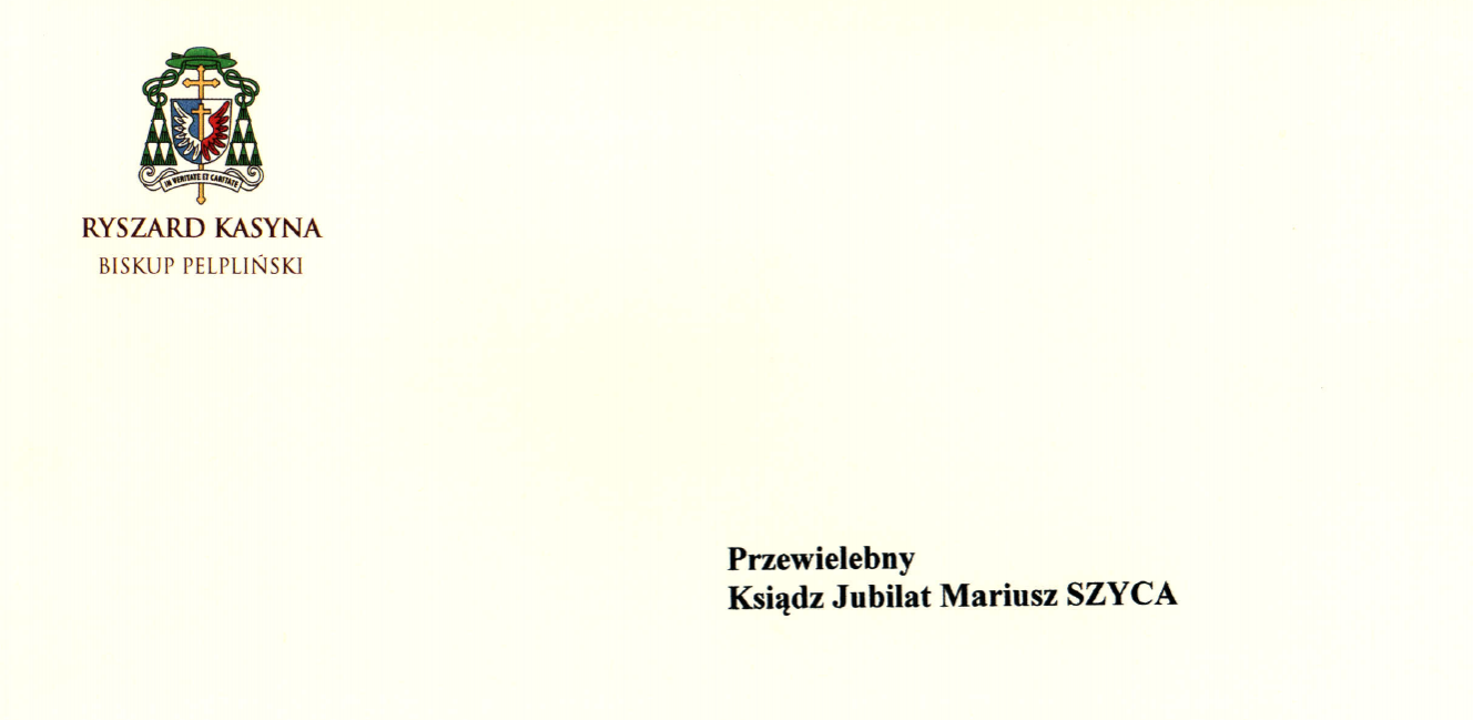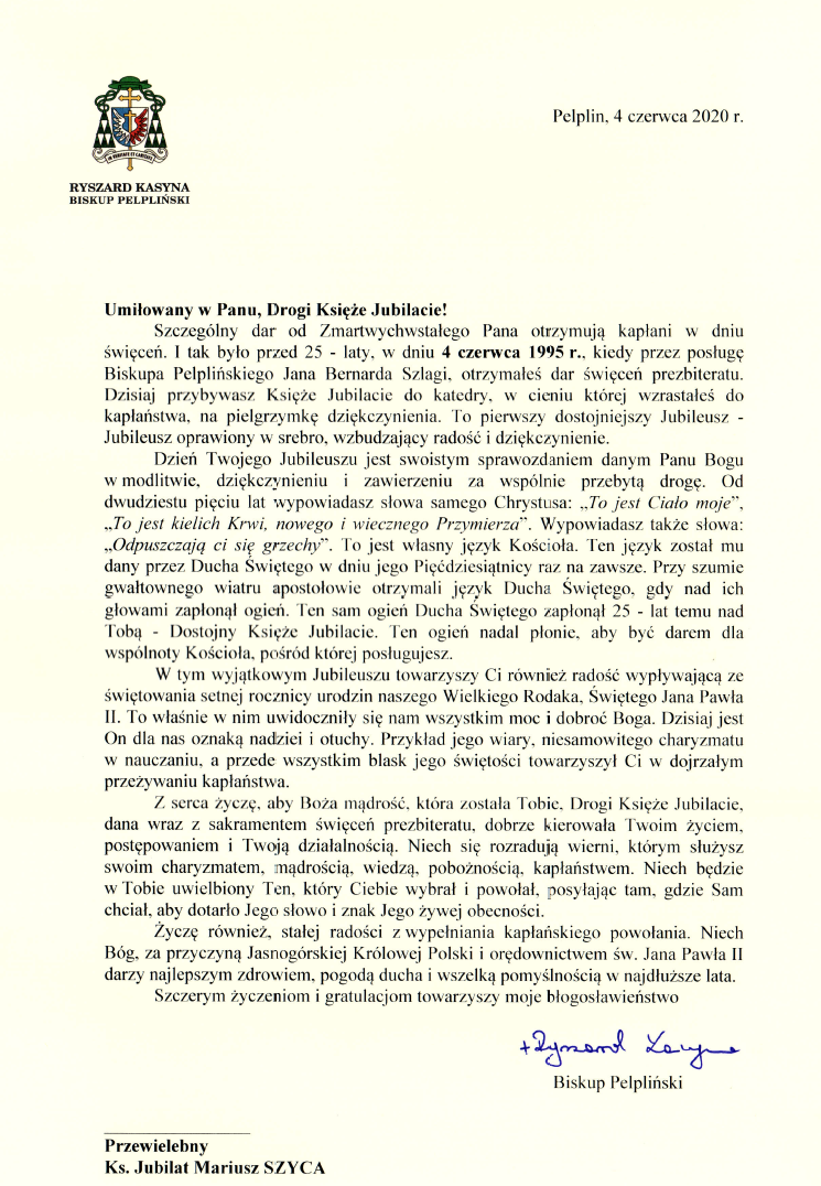 Biskup Diecezjalny Ryszard Kasyna z okazji jubileuszu 25-lecia kapłaństwa Księdza Proboszcza Mariusza Szycy przesłał list gratulacyjny z błogosławieństwem i życzeniami dalszej owocnej posługi.