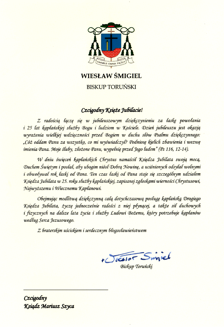 Biskup Toruński Wiesław Śmigiel z okazji jubileuszu 25-lecia kapłaństwa Księdza Proboszcza Mariusza Szycy przesłał list gratulacyjny z błogosławieństwem i życzeniami dalszej owocnej posługi.