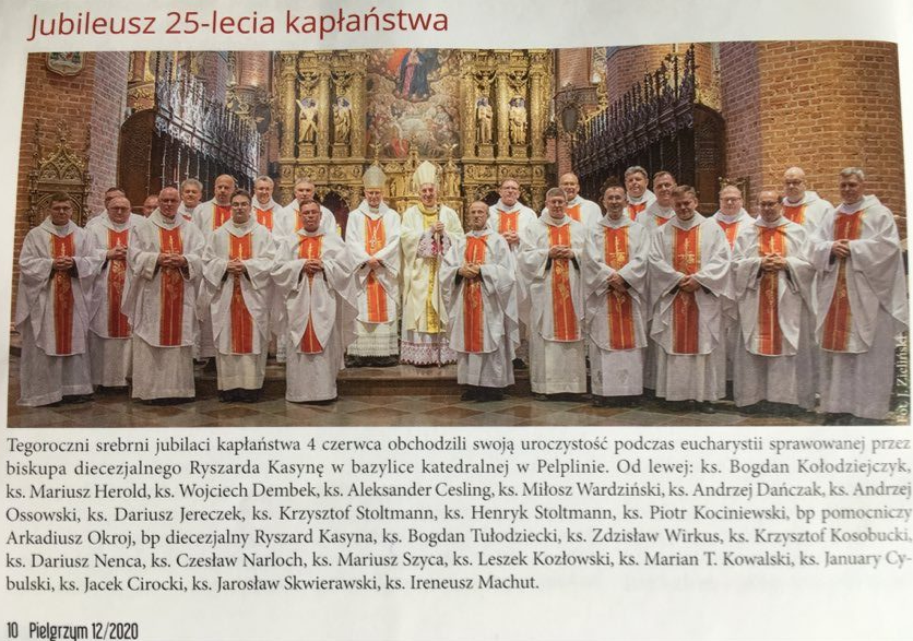 4 czerwca kapłani wyświęceni w 1995 roku świętowali 25. rocznicę przyjęcia święceń prezbiteratu. Wśród jubilatów był proboszcz naszej parafii ks. Mariusz Szyca. Jubileuszowa liturgia odbyła się w bazylice katedralnej w Pelplinie pod przewodnictwem biskupa diecezjalnego Ryszarda Kasyny. Relację z wydarzenia zamieścił dwutygodnik katolicki diecezji pelplińskiej "Pielgrzym" (na zdjęciu) oraz Katolicka Rozgłośnia Diecezji Pelplińskiej "Radio Głos" - http://www.radioglos.pl/wiadomosci/z-zycia-kosciola/7627-obchody-srebrnego-jubileuszu-kaplanstwa-w-katedrze