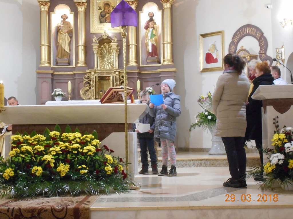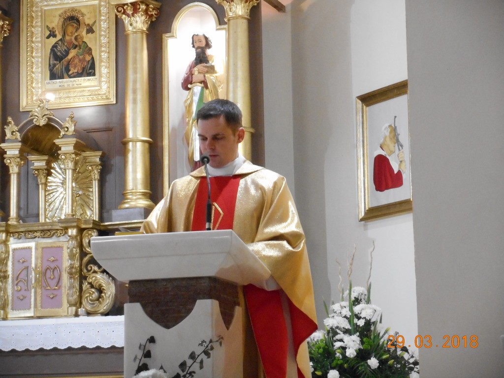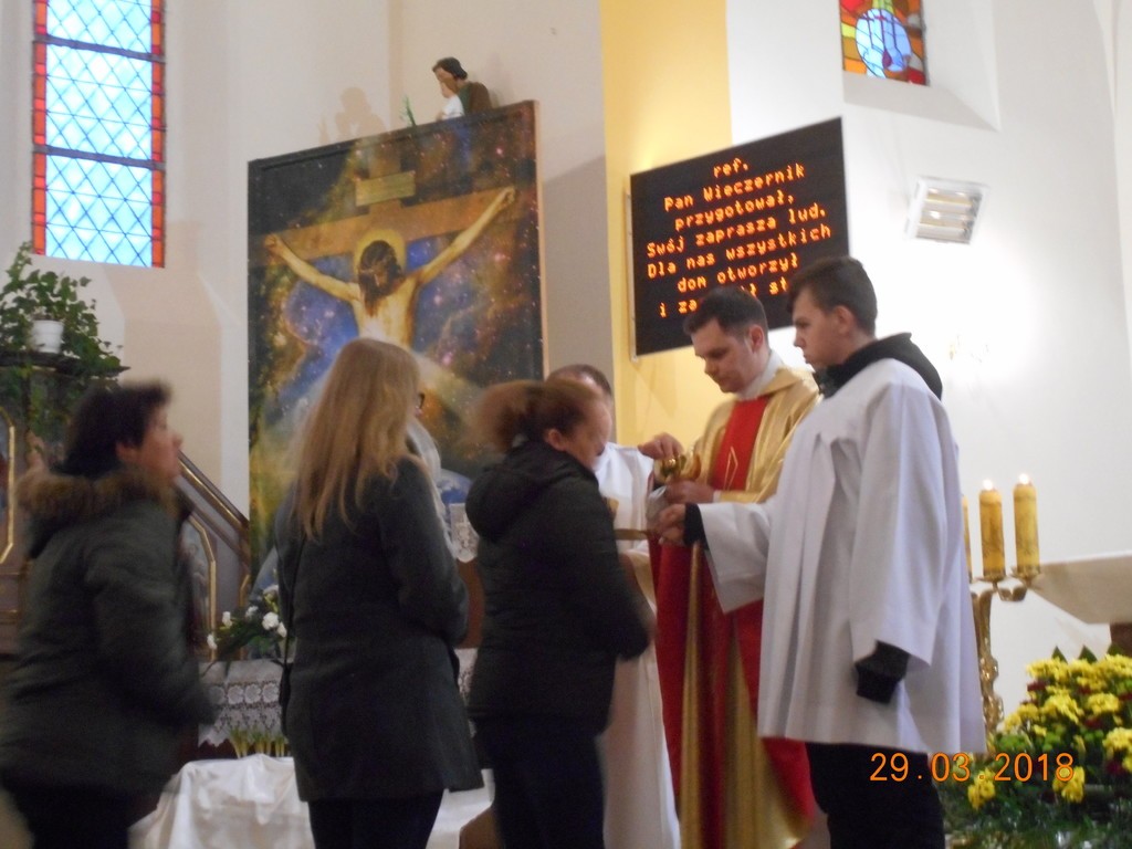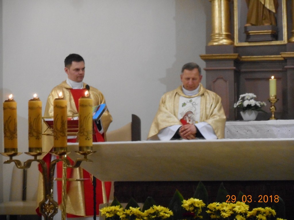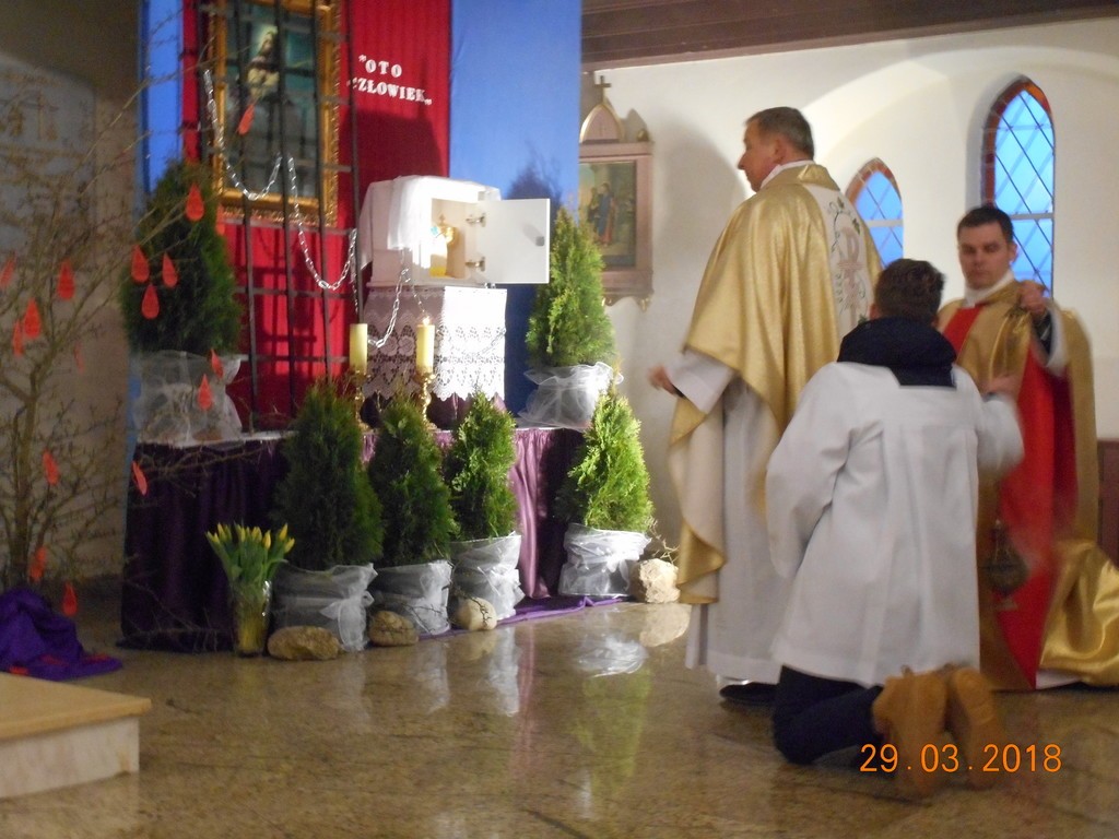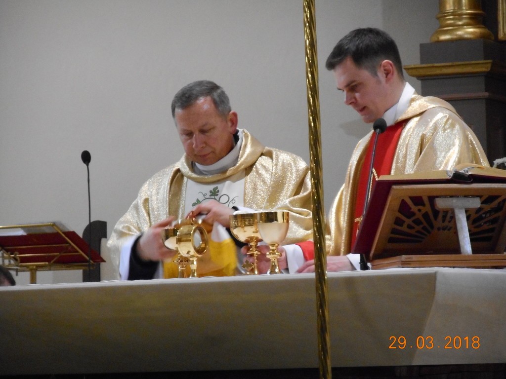 Uroczyste obchody Triduum Paschalnego rozpoczęliśmy Mszą Wieczerzy Pańskiej o godz. 18.00. W tym roku we Mszy św., która była dziękczynieniem za ustanowienie Eucharystii i kapłaństwa, uczestniczył także ks.Tomasz Syldatk z Białogóry. Wielki Czwartek to również Dzień Kapłana, toteż były życzenia i kwiaty od wdzięcznych parafian. Po Mszy św. w uroczystej procesji nastąpiło przeniesienie Pana Jezusa do tzw. ciemnicy i rozpoczęła się adoracja Najświętszego Sakramentu.