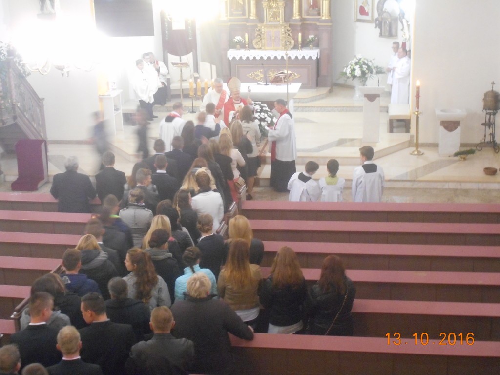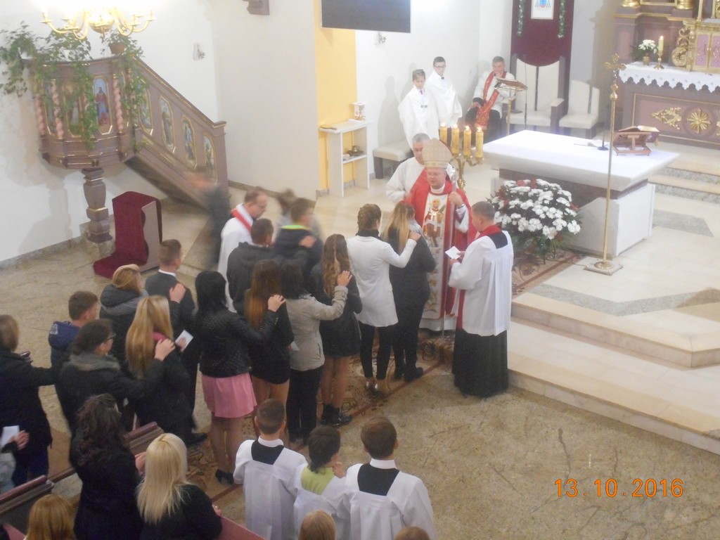13 października podczas Mszy św. o godz. 18.00 Jego Ekscelencja Ksiądz Biskup Wiesław Śmigiel udzielił naszej młodzieży sakramentu bierzmowania. Sakrament dojrzałości chrześcijańskiej przyjęło 29 kandydatów. Była to ostatnia grupa młodzieży, która objęta była dotychczasową formą przygotowania. Z dniem 1 września 2016 roku weszła w życie nowa, ujednolicona formacja kandydatów do bierzmowania, która będzie obowiązywać we wszystkich parafiach naszej diecezji. Cykl przygotowania potrwa dwa lata. Czas ten będzie służył przede wszystkim modlitwie oraz budowaniu więzi z Chrystusem i drugim człowiekiem.